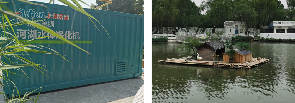 上海愛笛環境公司結合該景觀湖水質的具體情況,制訂了針對性的水質提升解決方案,采用愛笛的“????????????A-M 陶瓷膜河湖水體凈化機????????????+??復合生態浮島??”工藝,同時適當啟動原有的“人工瀑布+曝氣增氧機”,具有投資省、占地小、對周邊環境影響小、施工維護簡便、運行成本低、無二次污染等特點。通過修復水體生態,激活水體的自凈能力,并美化水體景觀,取得良好的治理效果。