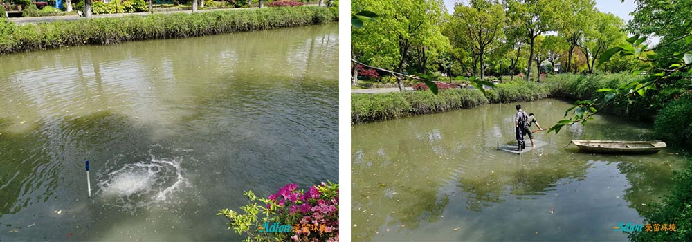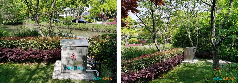 ??A-N型微納米曝氣機??1臺,給水體增氧。設置潛水推流機2臺,提高水體的流動性。并種植沉水植物及睡蓮、荷花等。通過修復水體生態,激活水體的自凈能力,并美化水體景觀,取得良好的治理效果。投資省、占地小、對周邊環境影響小、施工維護簡便、運行成本低、無二次污染。
