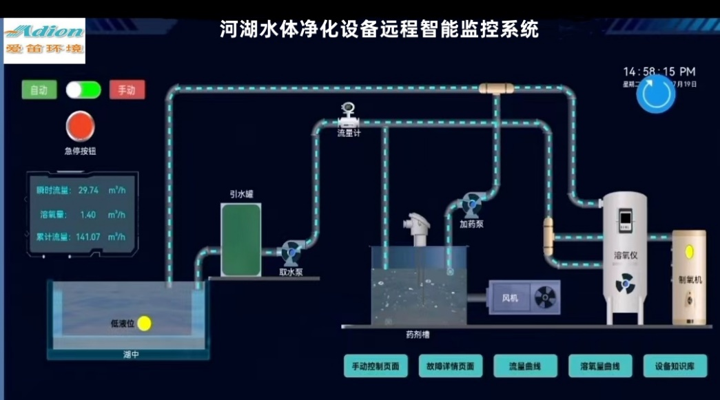 A-H河湖水體凈化機,分散布置。可結合水質情況,靈活調整設備的運行時長。用戶可選配帶物聯網云平臺功能,能通過手機對設備進行遠程監視、設定、控制。