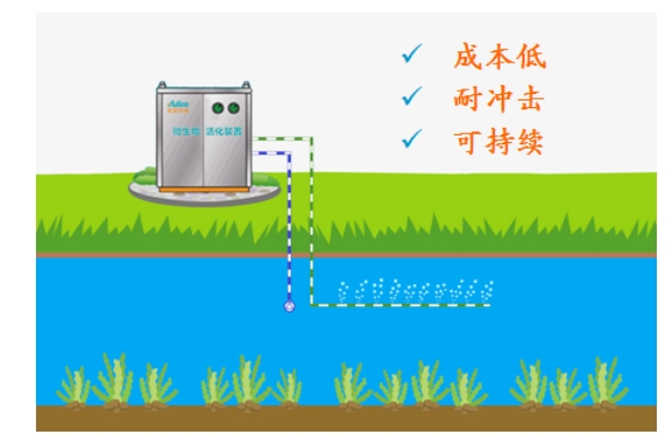 上海愛笛環境公司在多年治水經驗的基礎上,吸收國內國際的先進的技術,研發出了全新的“A-H復合型河湖水體凈化機”,該設備融合了“微納米增氧”和“土著微生物激活”兩種技術,在對水體進行高效增氧的同時,將經過設備強化激活的高活性本土微生物投加到水體中,使水體和底泥中微生物菌群得到快速的繁殖,降解水體中的有機污染物,最終使水體得到有效凈化。該設備具有效果好、投資省、運行費用低、維護方便等特點。該產品是上海愛笛自主研發的技術,經多條河道應用,效果良好。