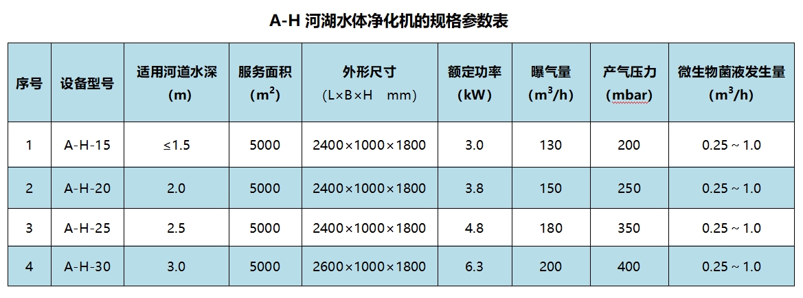 1. 主體設備—— A-H河湖水體凈化機:集“微納米增氧”與“土著微生物激活”功能于一體,提升水體溶解氧,改善水動力,并激活水體中的本土微生物,原位修復微生態,提高水體自凈能力