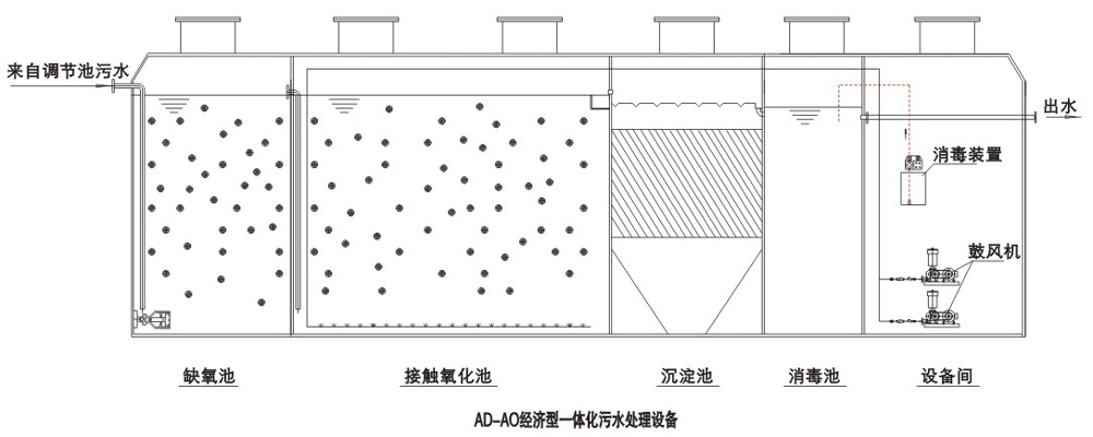 AD-AO型一體污水處理設備是本公司的一種常規型的污水處理設備。本公司采用“缺氧(A)+接觸氧化池(O)+沉淀池”組合工藝,設備出水可達到《污水綜合排放標準》GB8978-1996一級標準。