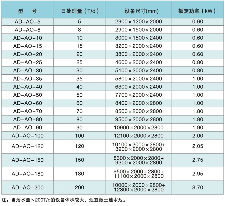 技術參數AD-AO型一體化污水處理設備規格參數表