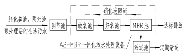 采用上海愛笛研發(fā)的A2-MBR污水處理設(shè)備作為核心工藝。在污水進(jìn)入設(shè)備之前需要預(yù)處理,根據(jù)生活污水水質(zhì)的特點(diǎn),對食堂污水進(jìn)行隔油處理;廁所污水進(jìn)行化糞處理。預(yù)處理后的水質(zhì)最終進(jìn)入反應(yīng)池內(nèi)進(jìn)行處理,出水可穩(wěn)定達(dá)到較高的排放或回用標(biāo)準(zhǔn)。