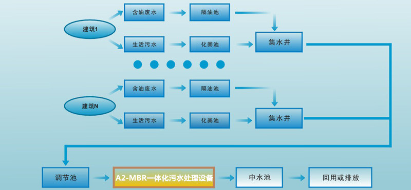 由于本公司的A-MBR系列設備的占地小、出水水質好、運行維護簡便等特點,與風景區污水處理項目的需求非常吻合,已得以廣泛應用。可根據用戶的水量大小和現場情況,在A1、A2或A3三大系列中選用合適的規格。工藝流程如下(以分片收集處理為例):